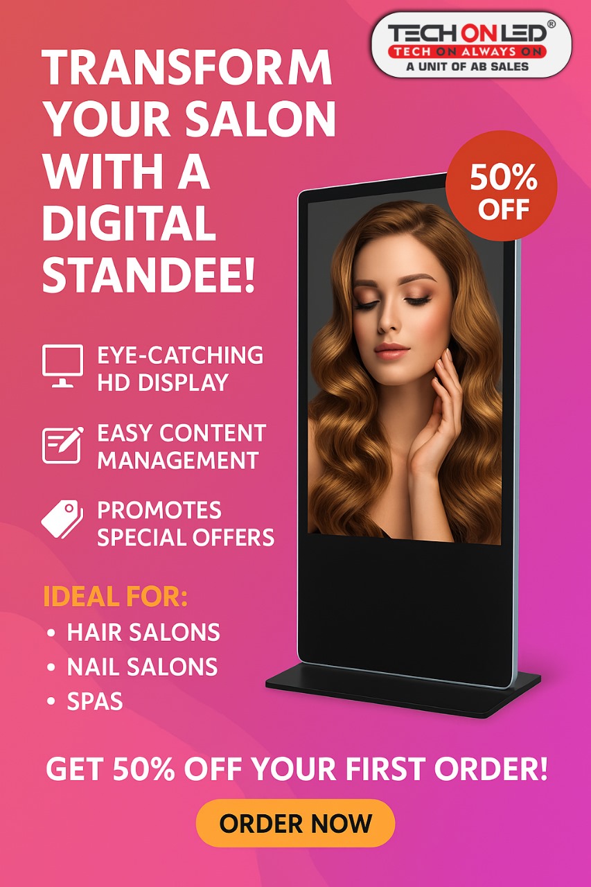 Make a bold impact with the 50″ T-Type Standee by Techon LED Ludhiana. With a large, vibrant Full HD display and stylish T-frame design, it is ideal for luxury showrooms, malls, exhibitions, airports, and corporate events, delivering high-end visual performance.