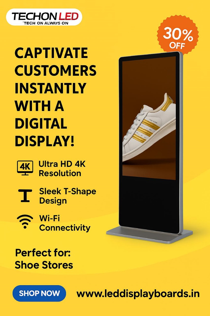 Command attention with the 65″ T-Type Standee by Techon LED Ludhiana. Offering a massive ultra-clear screen and premium T-frame design, it’s perfect for airports, large malls, conferences, exhibitions, luxury hotels, and corporate spaces needing high-impact digital branding.